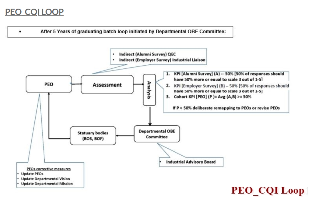 The Program Educational Objectives (PEO) CQI loop demonstrates how graduate outcomes are measured and used to refine program objectives, ensuring graduates meet the expectations of industry and society.